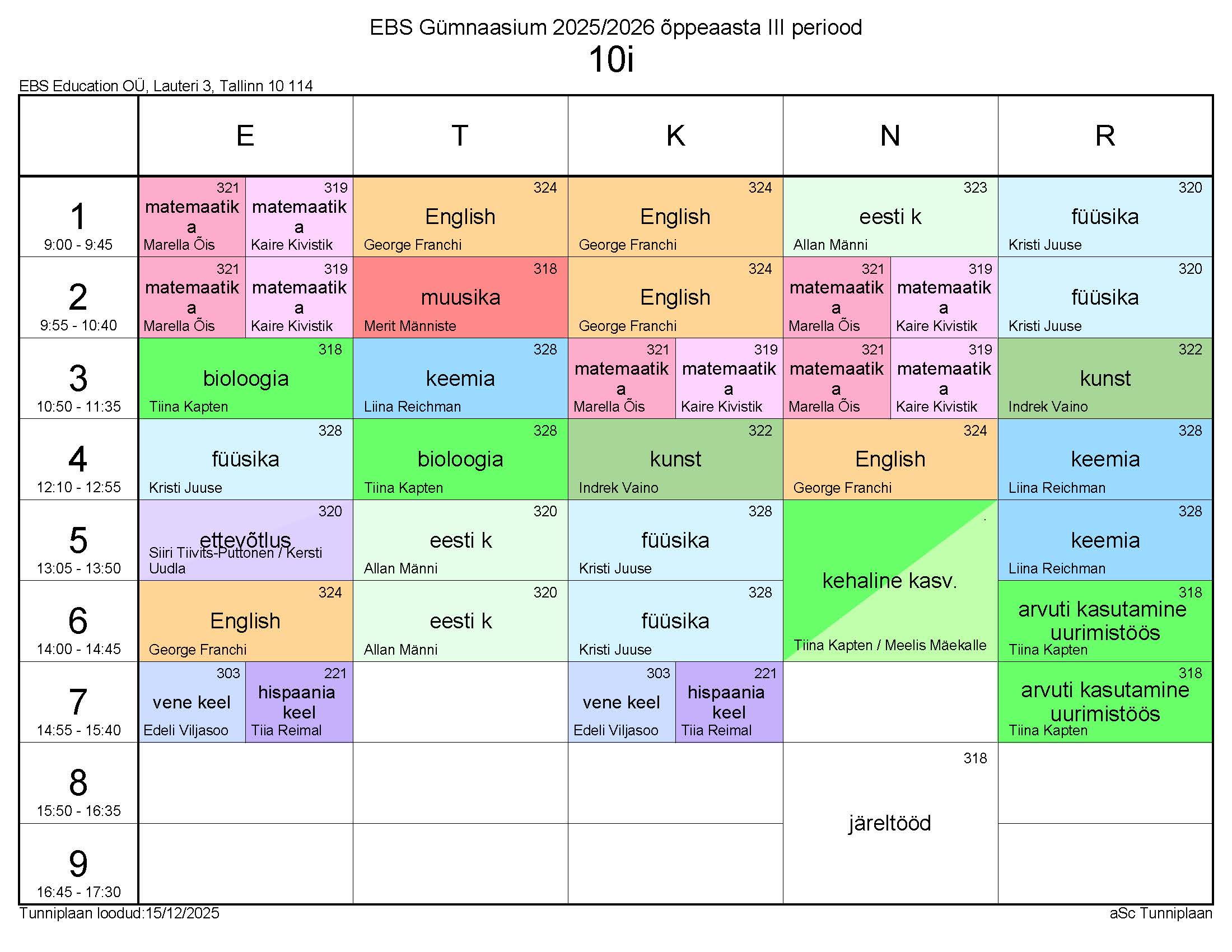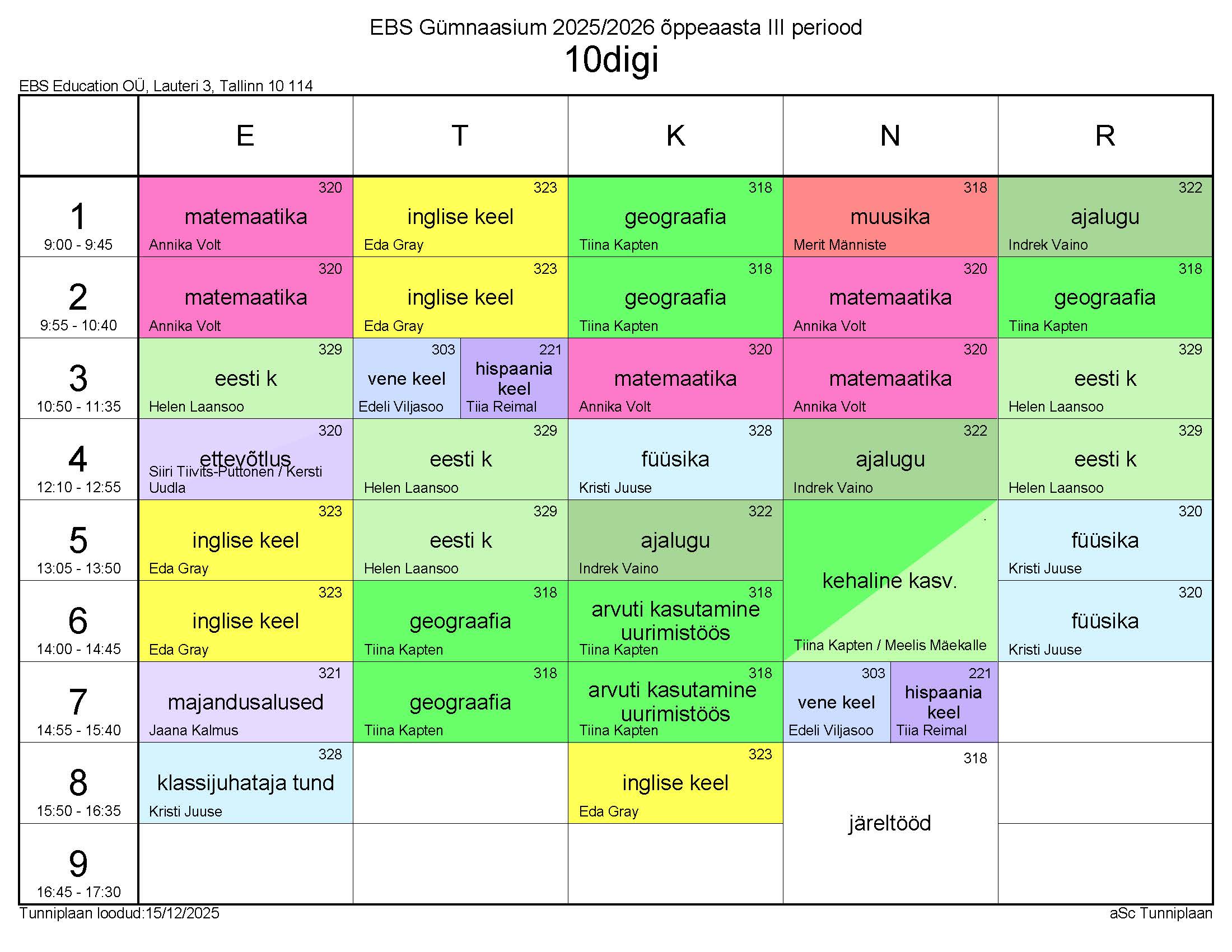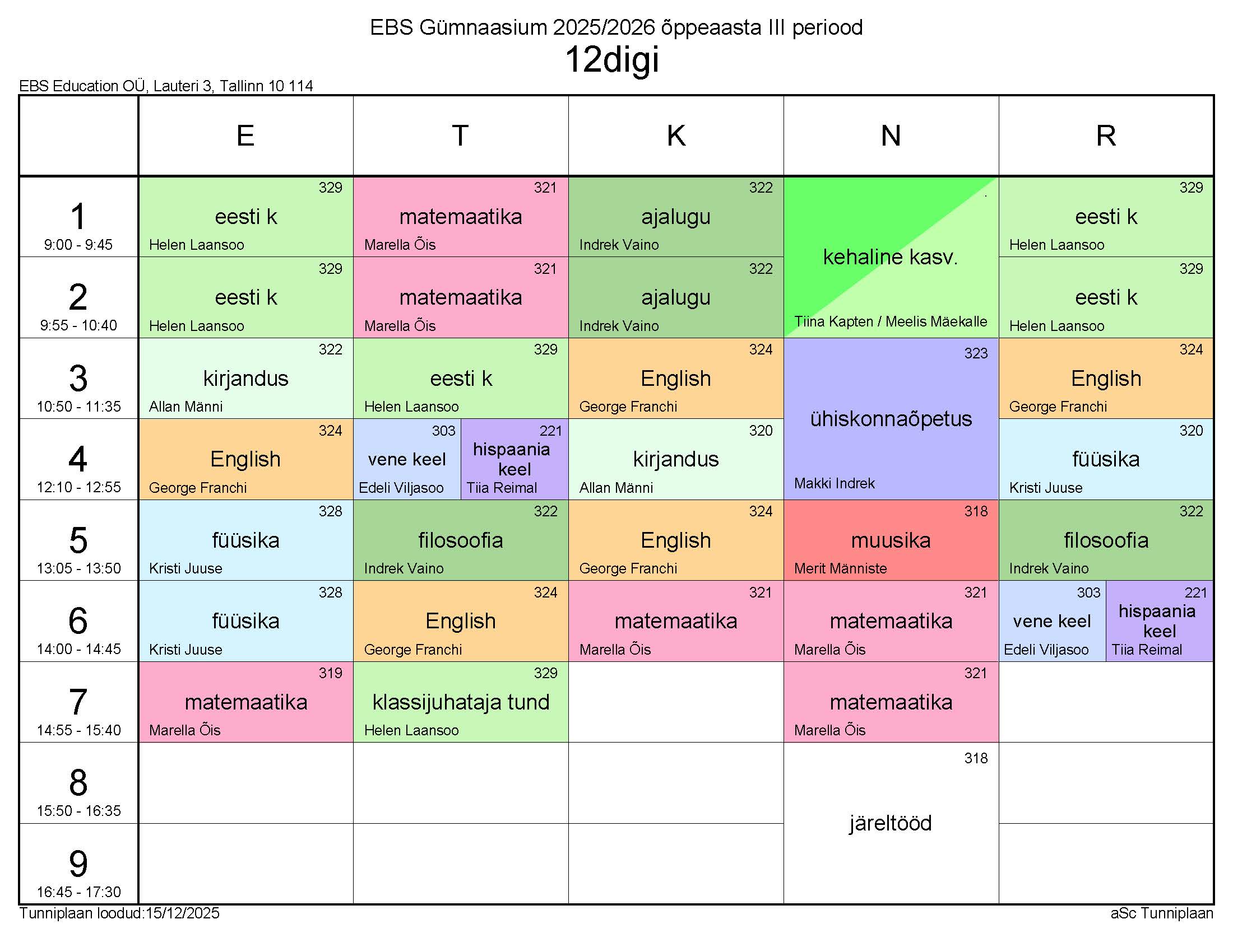 Tunniplaan 15.12.2025 – 13.02.2026